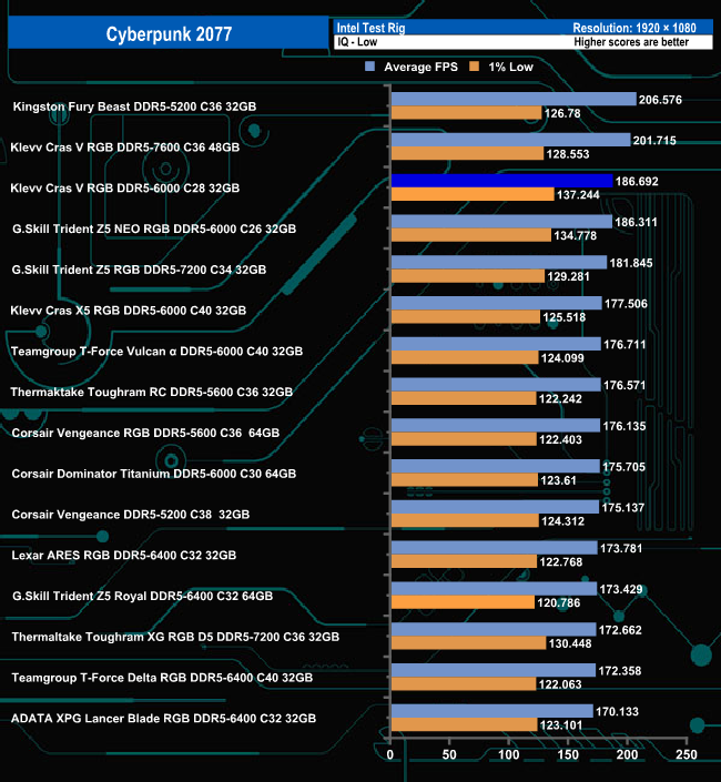 Regardless of the quality settings, the memory handles the Cyberpunk 2077 game benchmark very well. It sits in second place in the table with the Ultra settings enabled, oddly dropping down a place when low-quality settings are turned on.