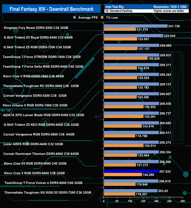 Using the maximum quality settings in the Final Fantasy XIV-Dawntrail benchmark, the memory sits in fourth from last place, but the margins are slim. Backing off the quality settings sees the modules drop down one place in the table.
