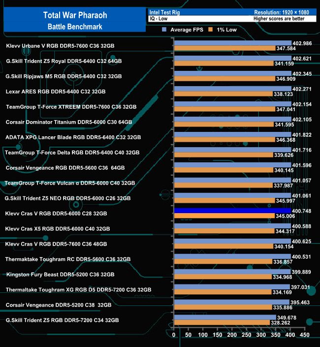 Using the Ultra quality settings, the C28 Klevv Cras V RGB 6000 memory sits in fifth place in the Total War Pharaoh – Battle benchmark results chart. Easing off the quality settings to Low sees the memory dropping down the the chart to the lower half of the chart. But in truth, there isn't much difference between the Cras V RGB 6000 and the Klevv Urbane V RGB sitting in first place on the chart.