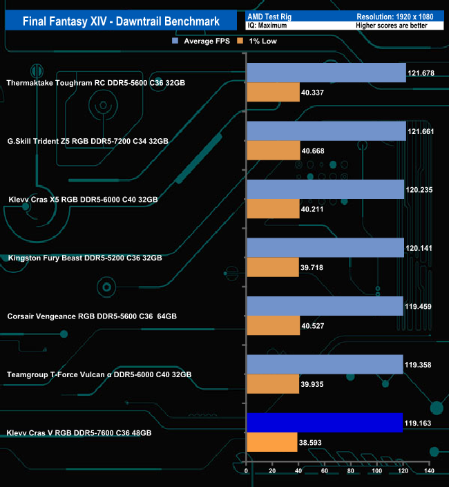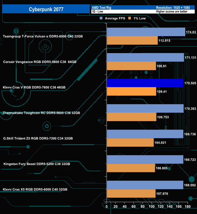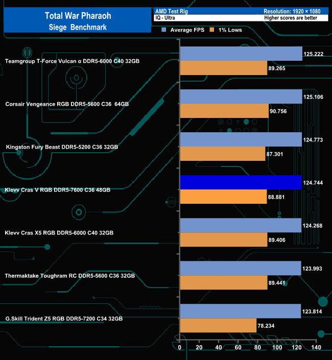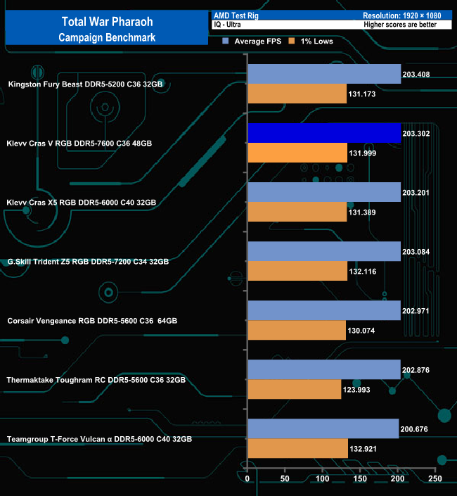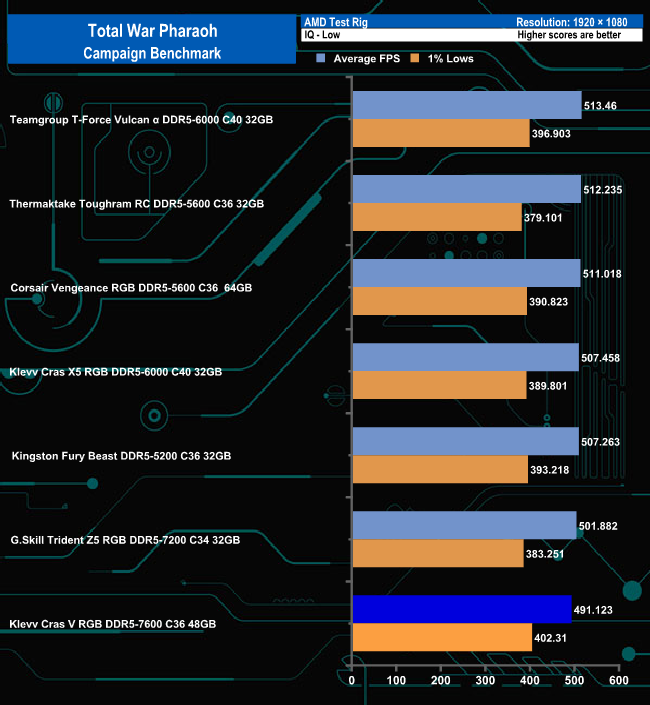 In the Campaign benchmark, there is only a 3fps difference between the fastest module and the slowest under the Ultra quality settings. However, switching to the Low quality setting sees the Klevv Cras V RGB in last place, 22fps behind the leading module.