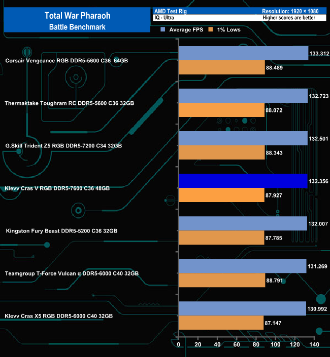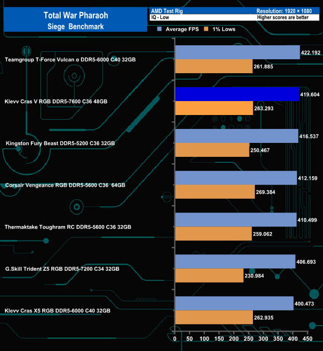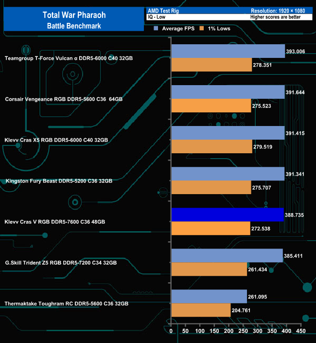 In the Battle benchmark of Total War Pharaoh's group of tests once again there's nothing much to separate any of the modules apart from the Thermaltake Toughram RC DDR-5600 which sits adrift from the others when the Low quality settings are used.