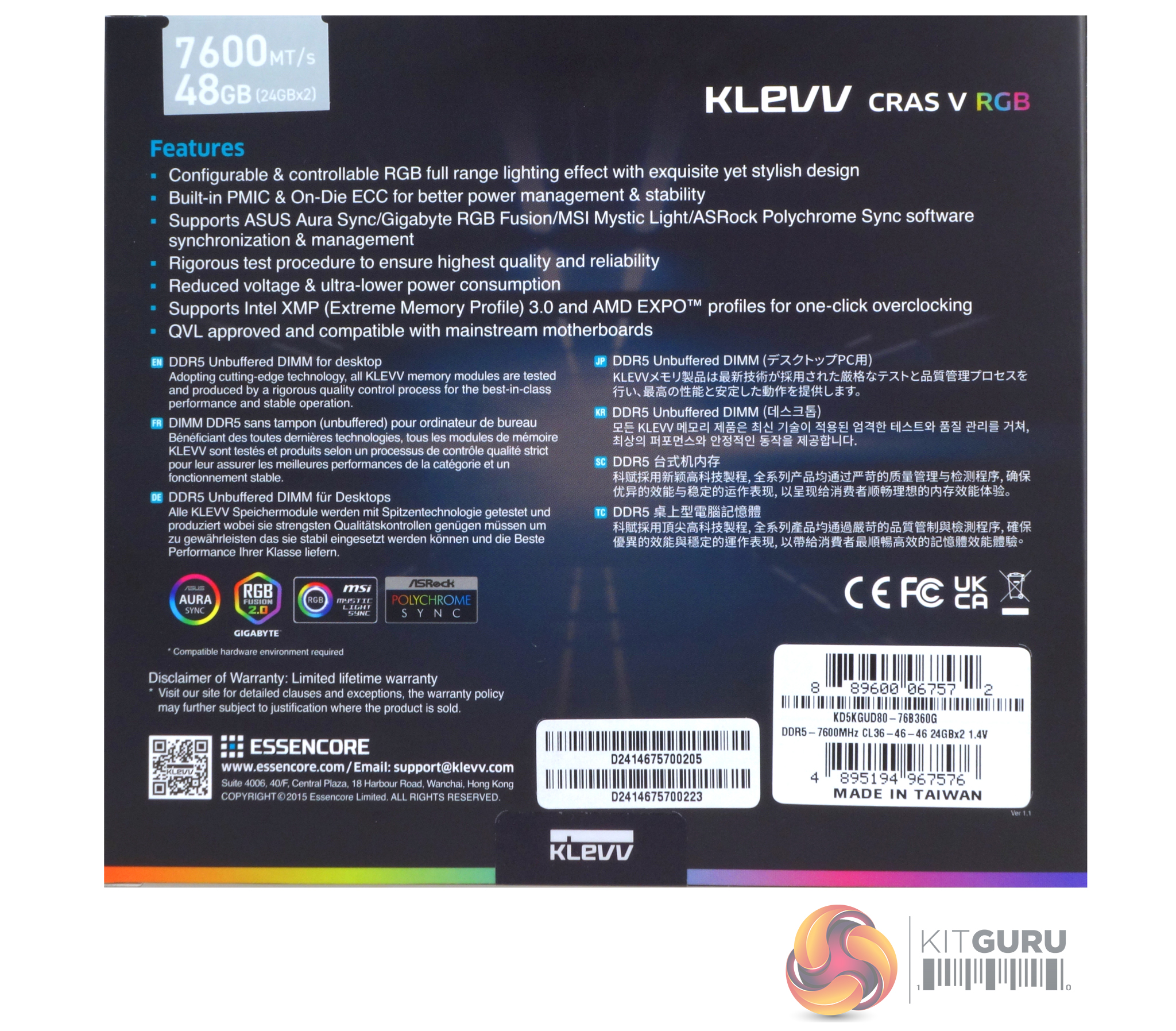 The front of the box has a good clear image of what the memory modules look like. At the top right of the box is a sticker displaying the memory speed and the kit capacity (in this case 7600MT/s and 48GB). The bottom left of the box has an icon displaying that the memory comes with a lifetime warranty, while the bottom right has the icons for Intel XMP and AMD EXPO support. At the top of the rear of the box is the other end of the speed and capacity sticker. Below this is a small feature list, multilingual information about the modules and icons displaying the motherboard RGB systems supported; Asus Aura Sync, Gigabyte RGB Fusion 2.0, MSI Mystic Light Sync, and ASRock Polychrome Sync.