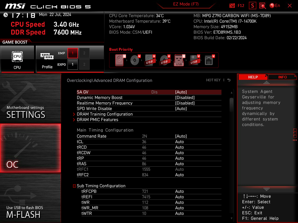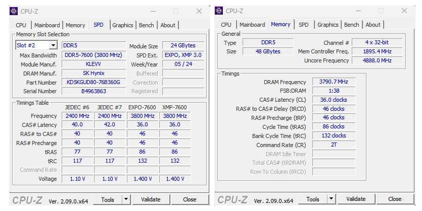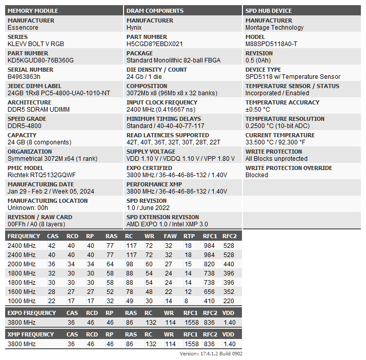 The memory runs at DDR5-4800 with timings of 40-40-40-77 natively with the XMP 3.0 and EXPO profiles supporting DDR5-7600 with 36-46-46-86 timings at 1.4V.