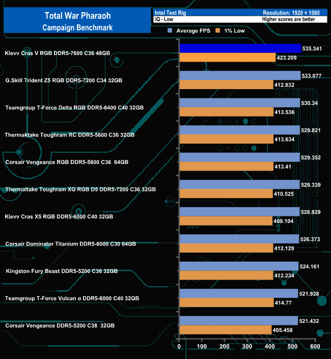 In the Campaign benchmark, the memory goes from one extreme to the other. Using the game Ultra settings it sits in last place on the results chart but switching to the Low-quality setting sees the memory jump to the top spot.