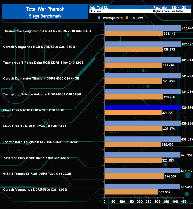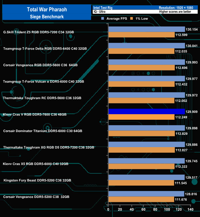 With the Siege benchmark, there's not much to choose between any of the modules regardless of what quality setting is used with the Cras V RGB sitting in a mid-table position for both.