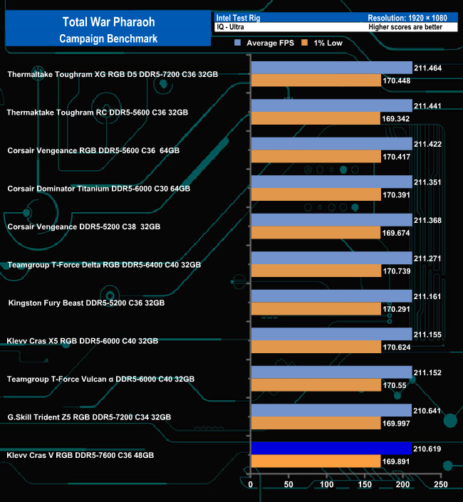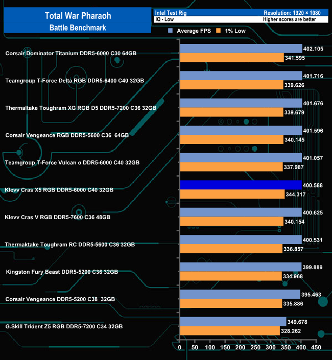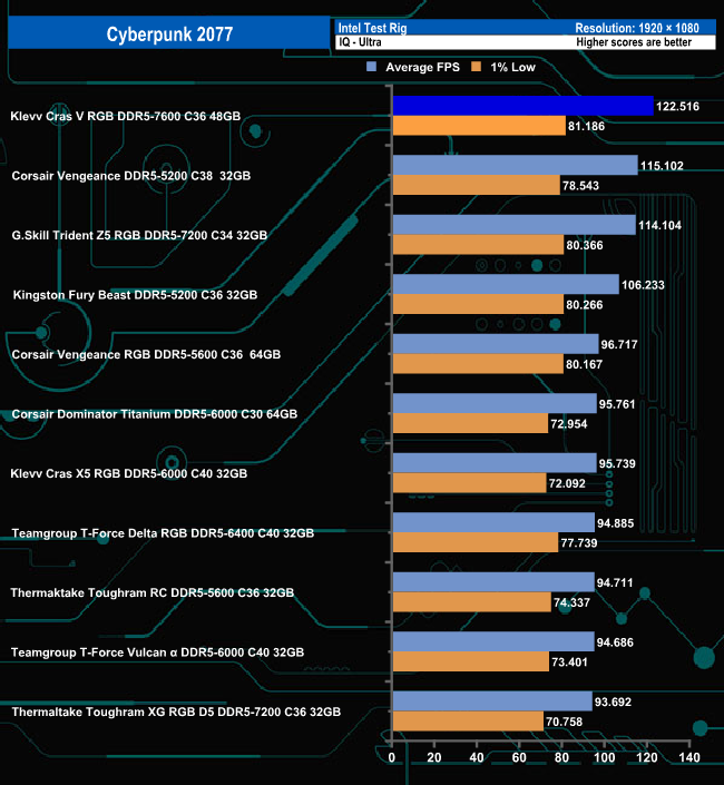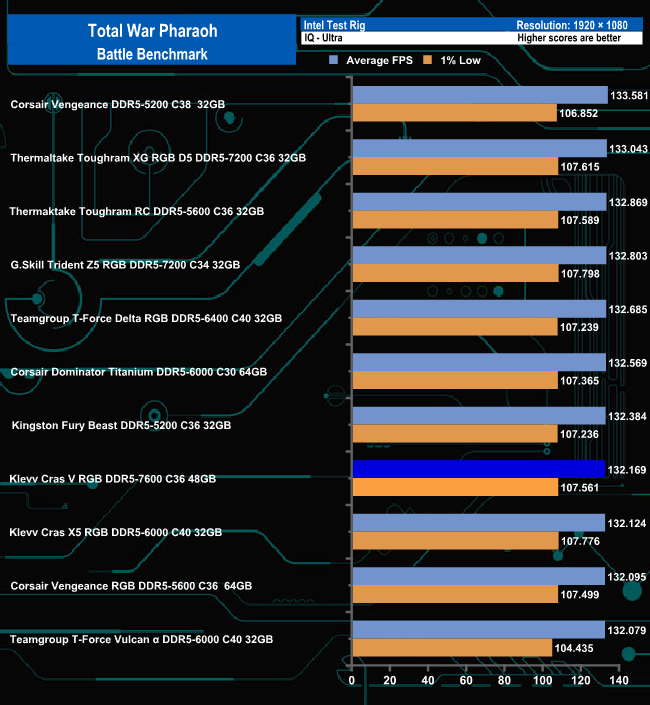 There's nothing between any of the modules in the Battle benchmark with the Ultra settings turned on with the Cras V RGB sitting in the lower half of the table. Using the Low settings differences soon become apparent with the Klevv Cras V RGB moving up to a mid-table position.