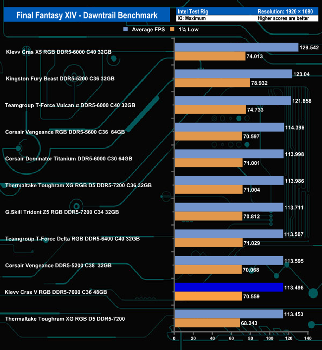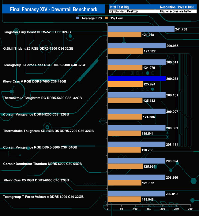 Using the Ultra quality settings the Klevv Cras V memory sits in last but one place in the results charts. Easing off the quality settings down to the Standard Desktop sees the memory shooting up the chart to lie in fourth place, just behind Teamgroup's T-Force Delta RGB DDR5-6400 modules.