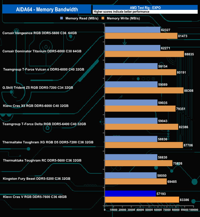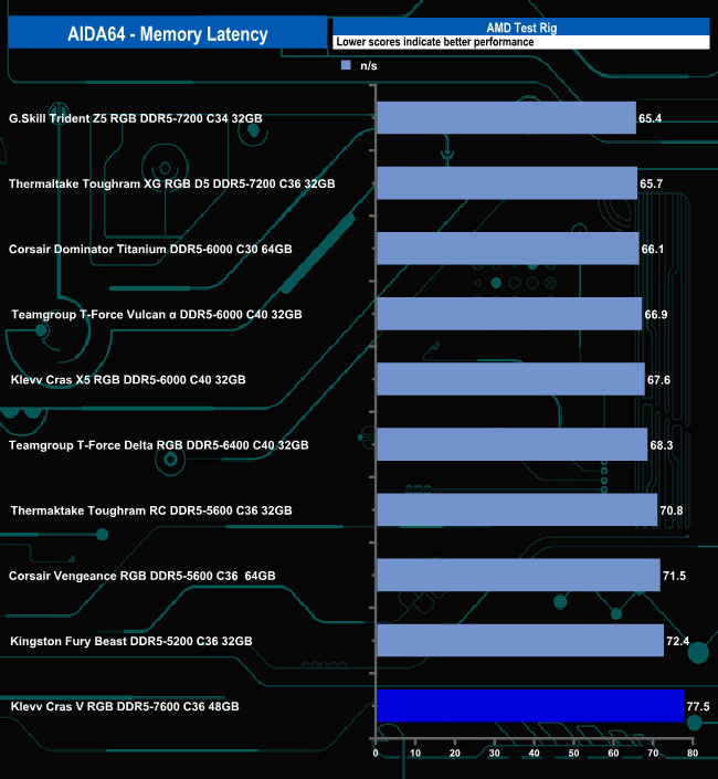 At 77.5n/s, Klevv's Cras 5 RGB DDR5-7600 is the slowest module we've seen to date using the AMD platform in the AIDA64 set of memory benchmarks.