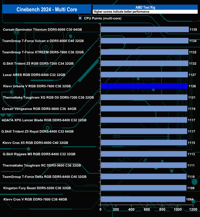 In the Cinebench 2024 multi-core test, the memory sits in the sixth spot on the results table, just 13 points behind the Corsair Dominator Titanium 6000MT/s kit in first place.