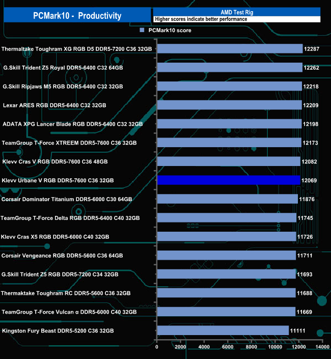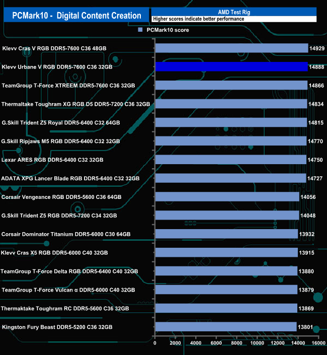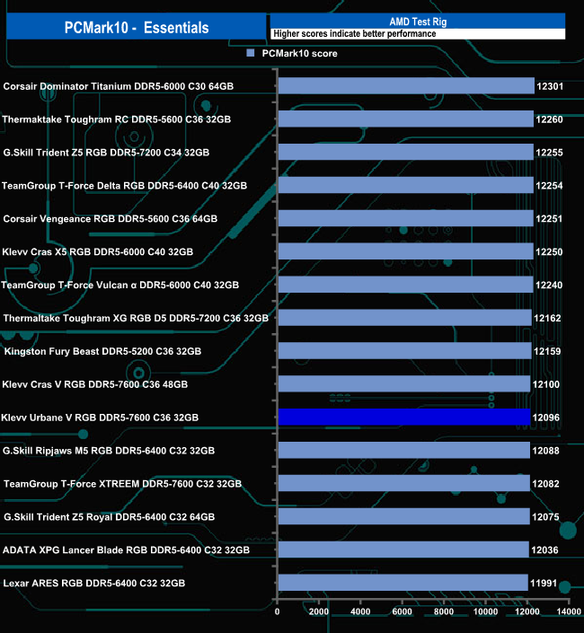 When tested with PCMark10, Klevv's Urbane V RGB 7600 kit produced a mixed bag of results.It's towards the bottom of the table for the Essentials group of tests, sits in mid-table for the Productivity tests but is in second place in the Digital Content Creation table.