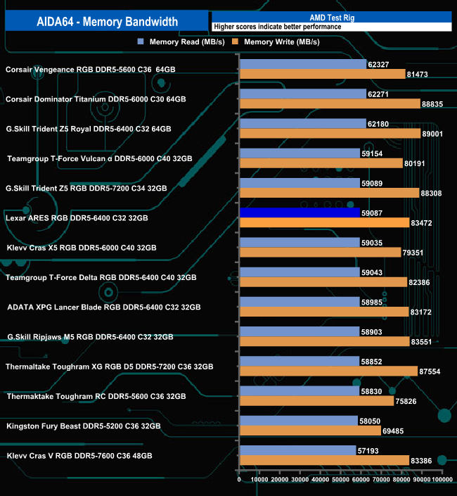 Testing the 32GB kit of Lexar's ARES RGB 6400MT/s with the AIDA64 memory benchmark produced a read figure of 59,087MB/s placing the kit just behind G.Skill's Trident Z5 RGB 7200MT/s in sixth place.