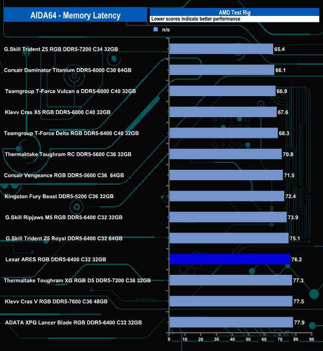At 76.2n/s, Lexar's ARES RGB 32GB kit is the second slowest 6400MT/s memory we've seen to date using the AIDA64 benchmarks and the AMD test platform.