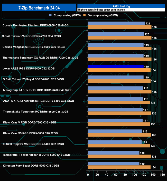 In the 7-Zip benchmark, the Lexar ARES RGB 6400MT/s kit sits in fifth place in the table but truth be told there isn't an awful lot in it between top spot and twelfth place on the table.