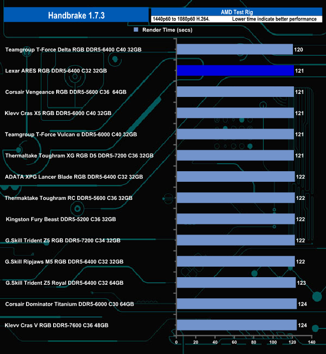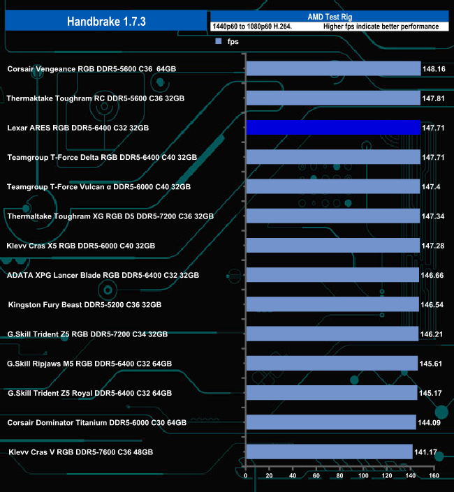 Lexar's ARES RGB DDR5-6400 32GB kit performs very well in the Handbrake test. With a frame rate of 147.71 fps (121n/s), it sits in third place in the results chart, just behind Thermaltake's Toughram RC 5600MT/s kit.