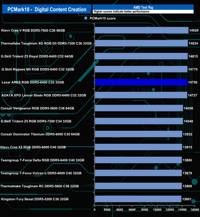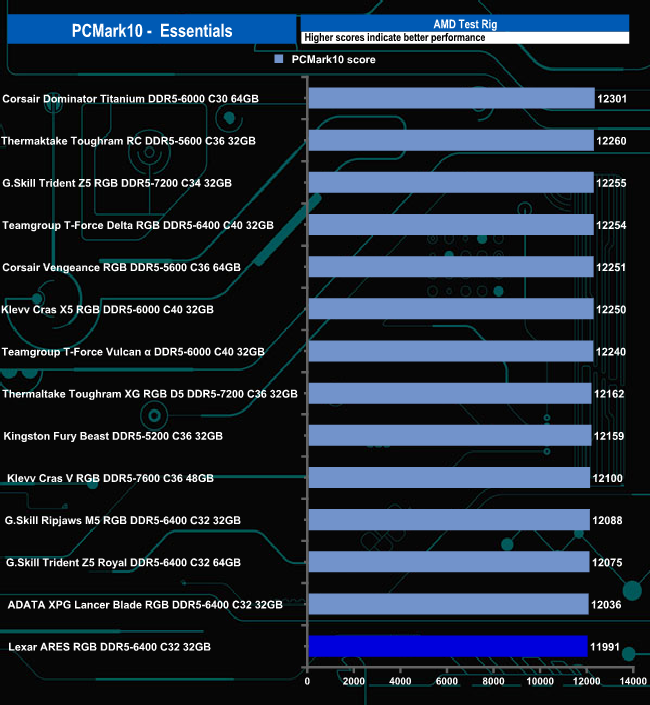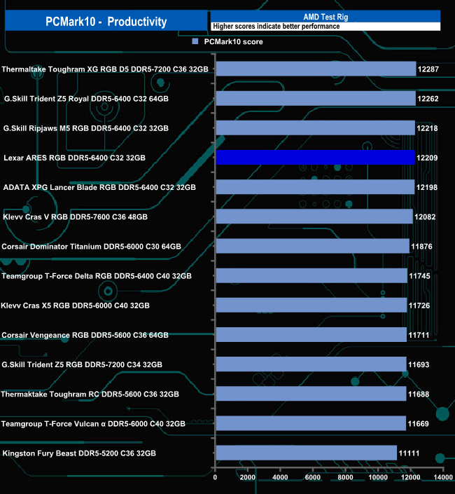 The ARES RGB didn't handle the Essential test traces of the PCMark10 benchmark very well in the AMD system as it sits in last place in the table with a score of 11991. It's much happier dealing with the Productivity and Digital Content Creation traces.