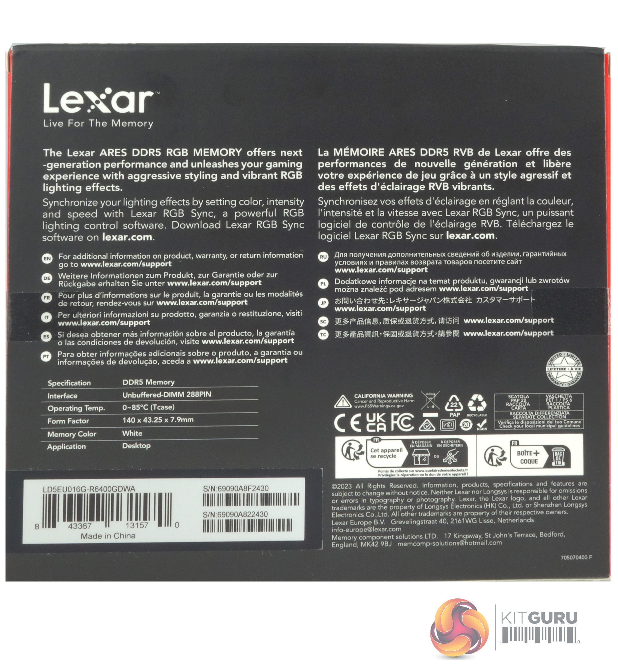 The front of the box has a clear image of what the memory modules look like, including how the RGB works. At the top right of the box is a line of icons representing the various motherboard RGB software packages the memory supports; Asus Aura Sync, Gigabyte RGB Fusion 2.0, MSI Mystic Light Sync, and ASRock Polychrome RGB. Under the image and to the right is a sticker displaying the kit size, memory speed and XMP/EXPO support.