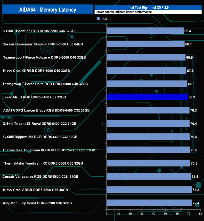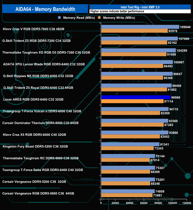 When tested with the memory bandwidth test in AIDA64, the DDR5-6400 version of Lexar's ARES RGB memory produced a read figure of 96,986MB/s putting it just below G.Skill'sTrident Z5 Royal RGB 6400MT/s memory in the middle part of the results table.