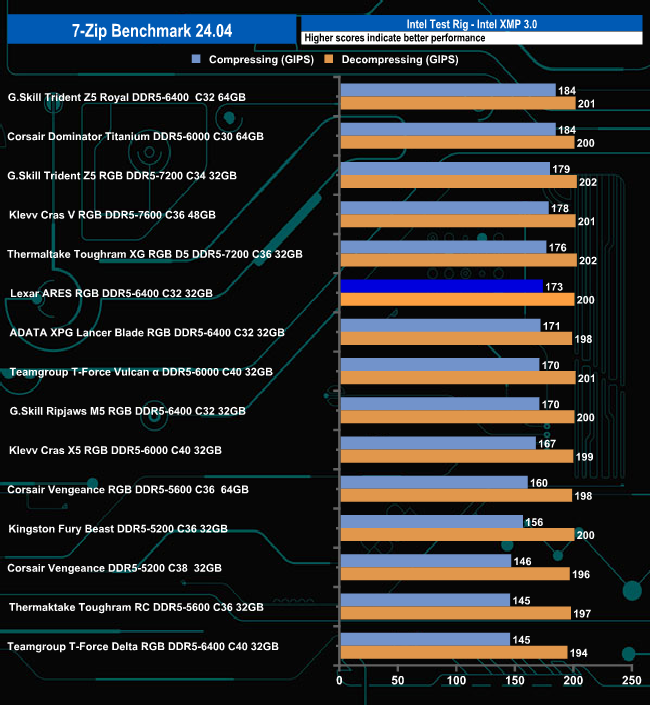 In the 7-Zip Compressing benchmark, the ARES RGB 6400MT/s Compressing score of 173 GIPS sees it in 6th position on the results chart, just behind Thermaltakes's Toughram XG RGB 7200MT/s C36 memory.