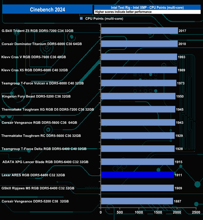 The Lexar ARES RGB 6400MT/s memory doesn't seem to handle the Cinebench 2024 multi-core test too well with only G.Skill's Ripjaws M5 RGB 6400MT/s and Corsair's Vengeance 5200MT/s memory keeping it off the bottom spot on the results chart.