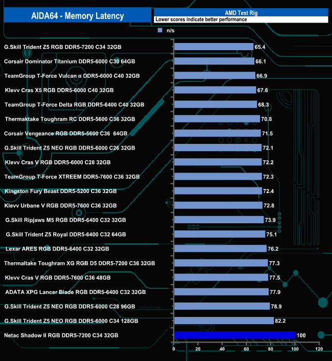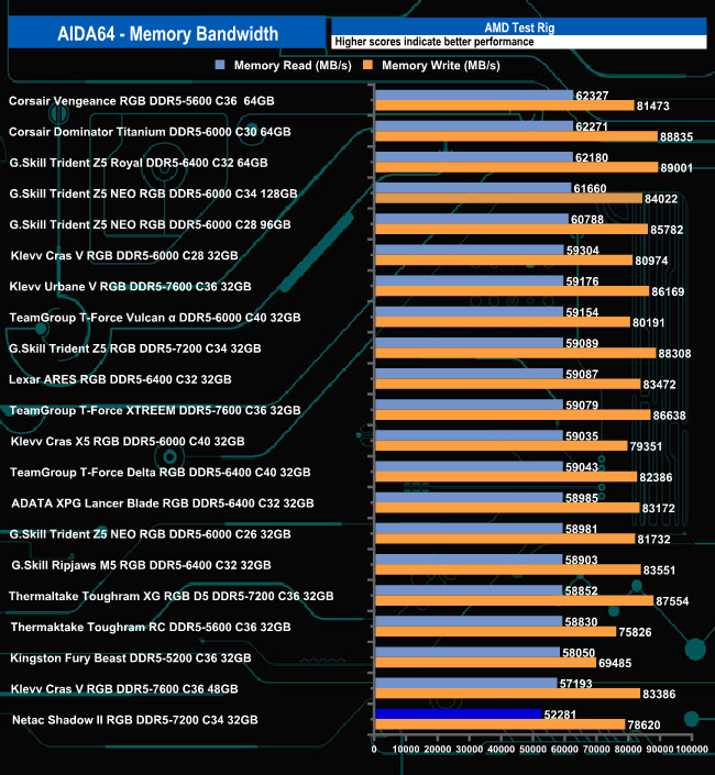 When tested with the AIDA64 memory benchmark, the 32GB kit of Netac's Shadow II RGB DDR5-7200 C34 produced a read figure of 52,281MB/s, a result which places the modules in last place.