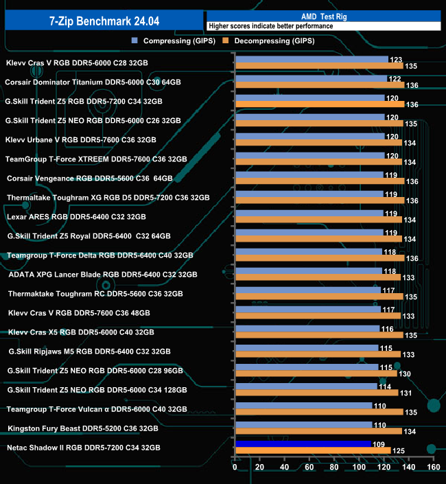 In the 7-Zip benchmark, the Netac Shadow II RGB 7200 sits in last place in the results table, but there isn't an awful lot in it between it and the two kits above it, Teamgroup's T-Force Vulcan α 6000MT/s C40 and the Fury Beast 5200MT/s C36 from Kingston.