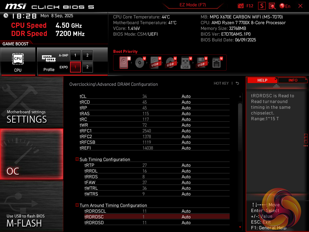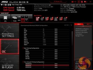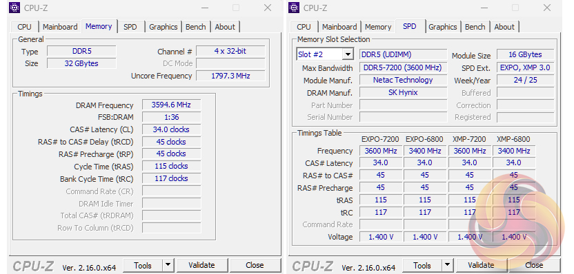 The memory runs at DDR5-5600 with timings of 46-45-45-90-135 (1.10V) natively with the two EXPO and Intel XMP profiles supporting DDR5-6800 (34-45-45-115) and DDR5-7200 (34-45-45-115) both at 1.40V.