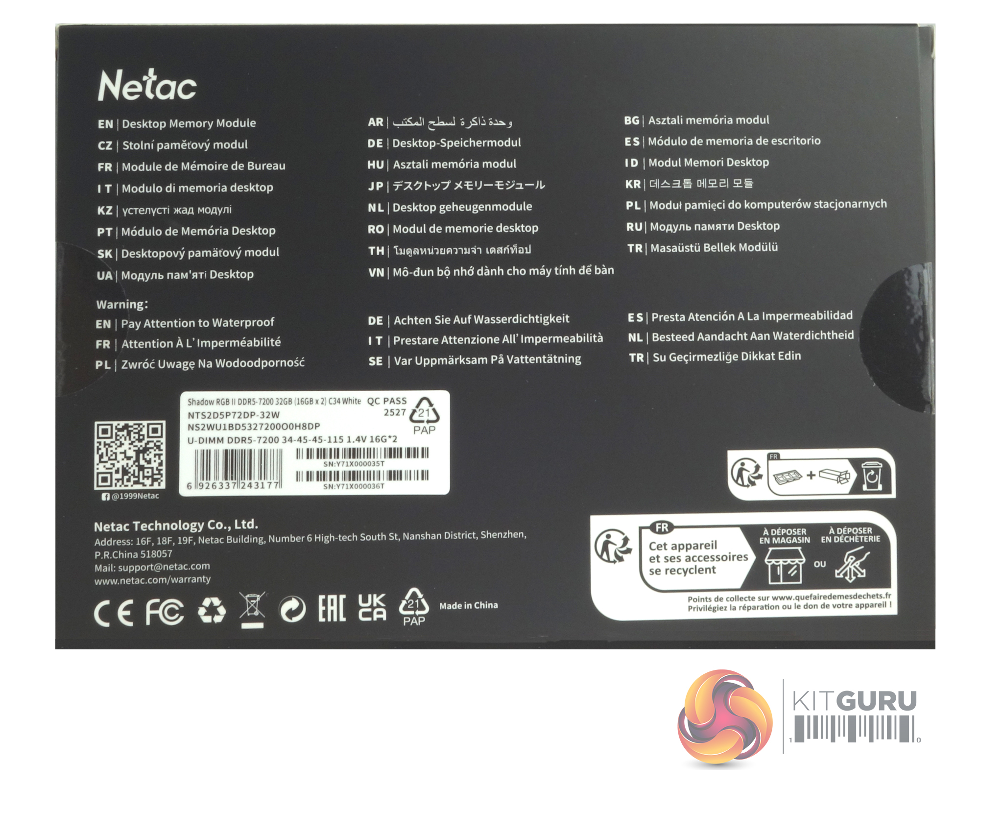 The front of the box has a good, clear image of one of the modules, which has a gloss finish, making it pop out a little against the matt finish of the remainder of the box. The only other thing of note on the front, besides the module name, is an image confirming the lifetime warranty Netac backs the kit with. The back of the box is covered in multilingual bullet points about it being a desktop memory module.
