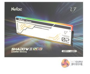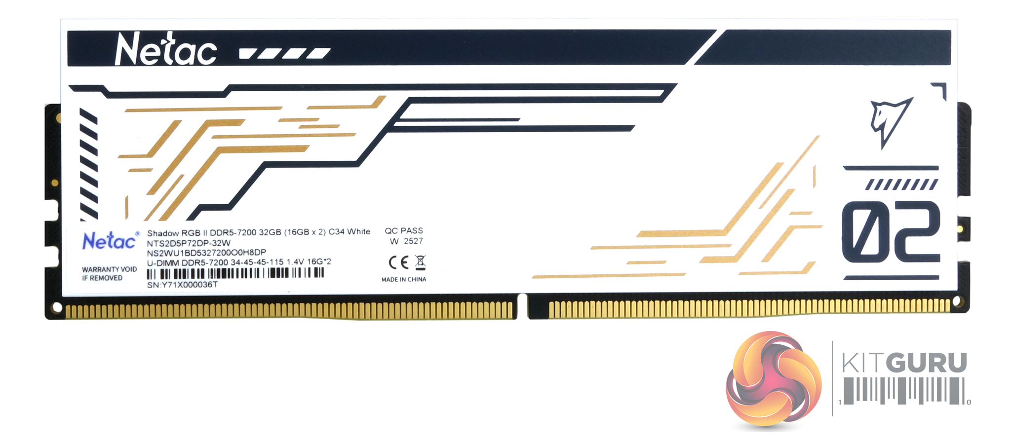 The heat spreaders on the modules are made from aluminium, finished in white (a black version is also available). The spreaders give the module a height of 43.3mm, and at the top sits the RGB defuser bar, which covers eight RGB zones. Netac don't have any in-house RGB software (at the time of writing), but the memory is supported by most of the motherboard RGB controllers on the market. The white finished module looks quite striking with a black band running along the top, which holds the Netac name, while the main body of the heatspreader has intricate patterns of black and gold lines on it. The modules are a single-rank design; under each heatsink, there are eight SK hynix A-die (H5CG48AGBDX018) ICs along with a power management IC (PMIC).