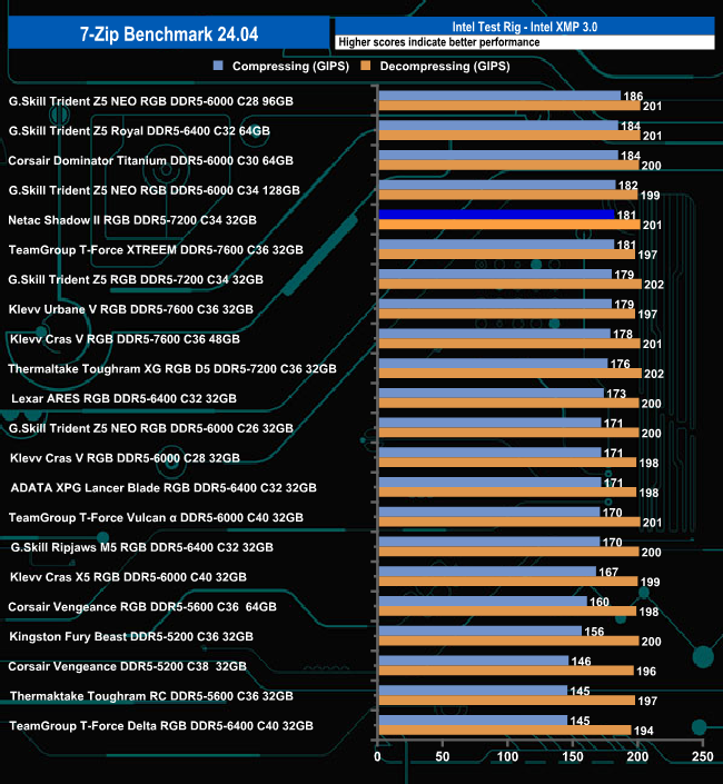 In the 7-Zip Compressing / Decompressing benchmark, Netac's Shadow II RGB sits in fifth position in the results chart. However, the truth be told, there isn't much difference between it and the other modules in the top half of the results chart.
