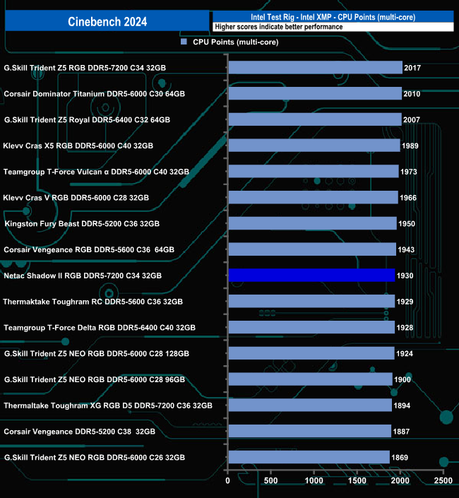 With a multi-core CPU points score of 1930, the Notac Shadow II RGB 7200 kit sits in a mid-table position in the Cinebench 2024 results chart.