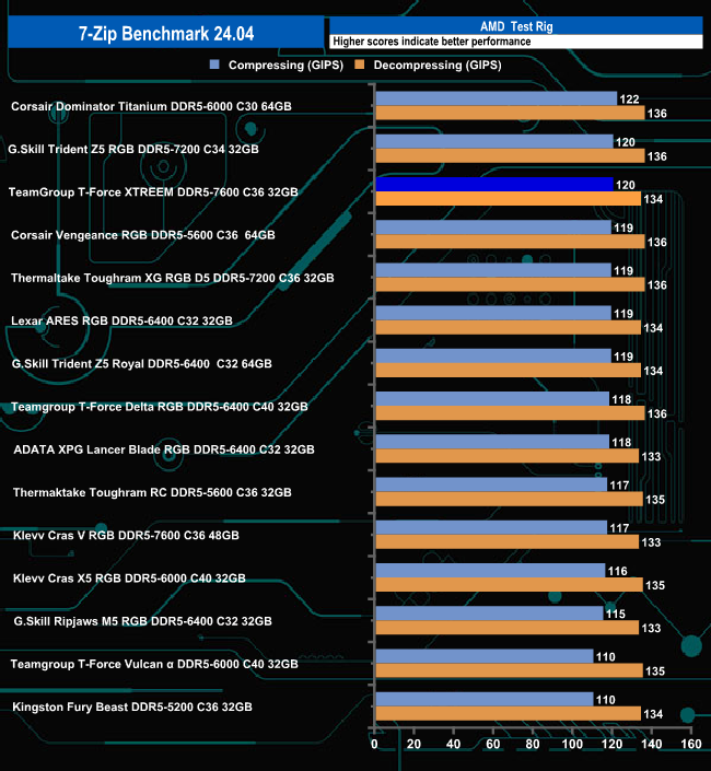 In the 7-Zip benchmark, the T-Force XTREEM 7600 sits in third spot in the table. Truth be told there isn't an awful lot in it between top spot and tenth place on the table.