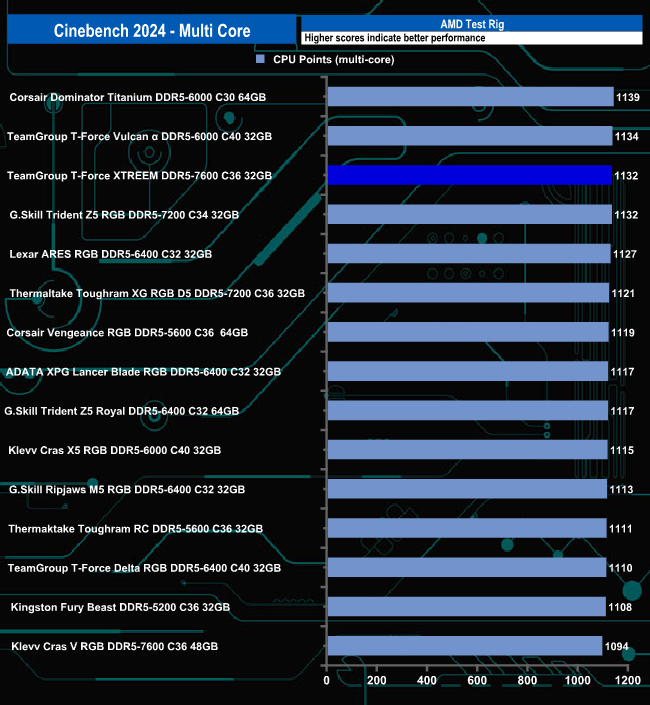 In the Cinebench 2024 multi-core test, the memory sits in the third spot behind TeamGroup's T-Force Vulcan α 6000 and Corsair's Dominator Titanium 6000.