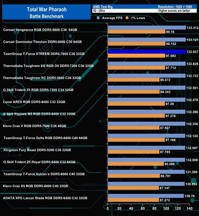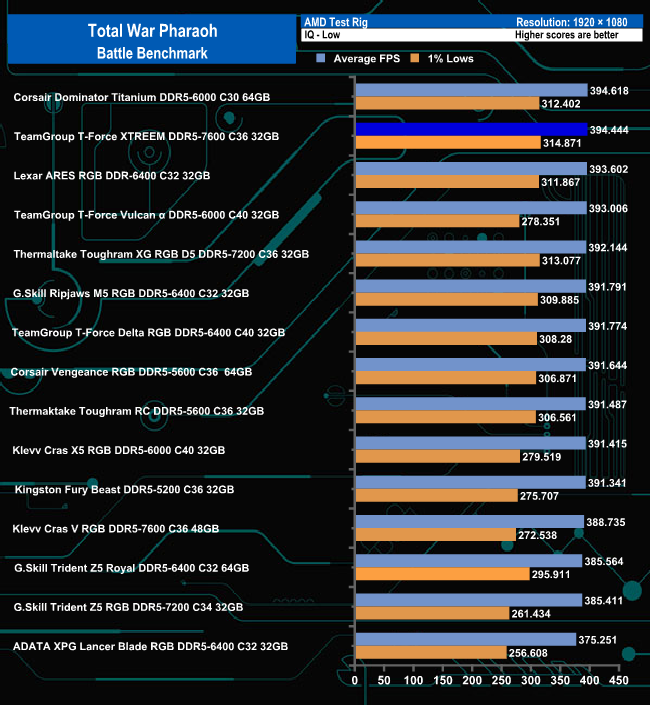 In the Total War Pharaoh Battle benchmark, the results see the memory sit in third spot using the games Ultra quality settings and second position using the Low settings.