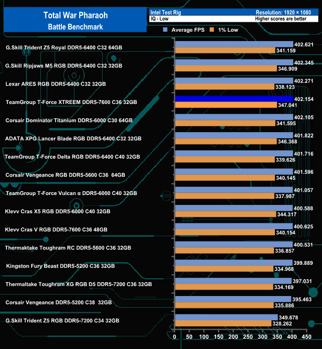 In the Total War Pharaoh Battle benchmark, the T-Force XTREEM sits in the top ten results using the Ultra settings and in the top 5 using the Low settings. However, truth be told there's hardly anything in it between any of the modules in top half of the results chart for both quality settings in this test.