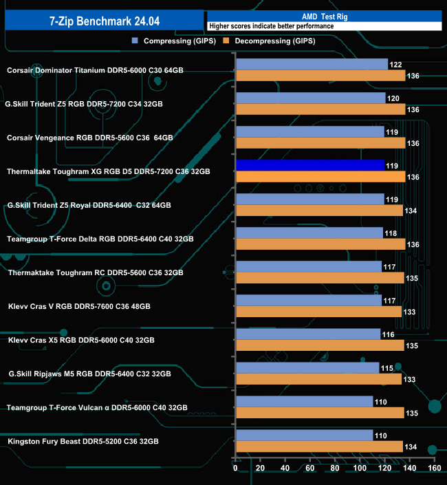 The ToughRAM XG RGB D5 7-Zip compressing and decompressing performance is pretty solid, sitting in the top five of the results chart.