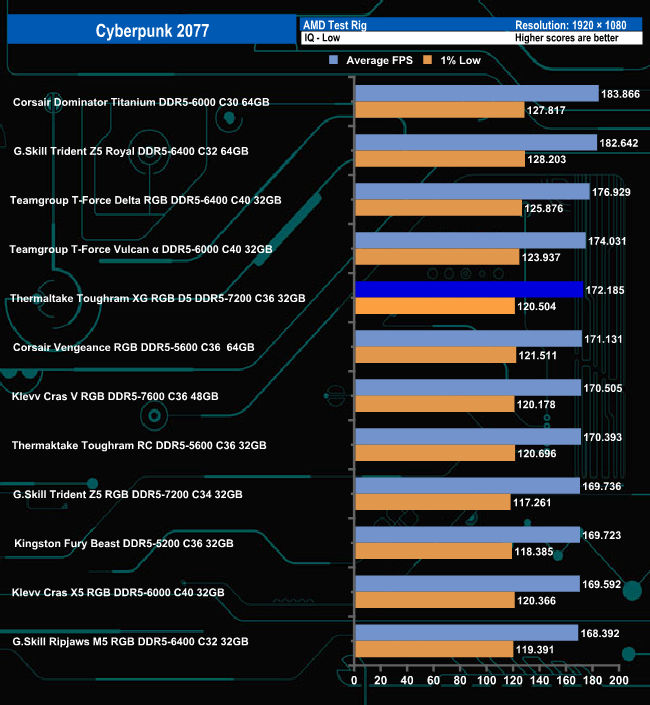 Thermaltake's ToughRAM XG RGB D5 average frame rate score of 99.638fps is good enough to put into second place in the results chart although its 1% low score isn't as good. Switching to test the memory at Low quality sees the memory drop down a couple of places in the chart.
