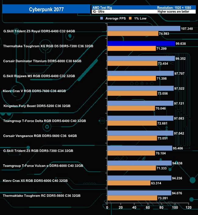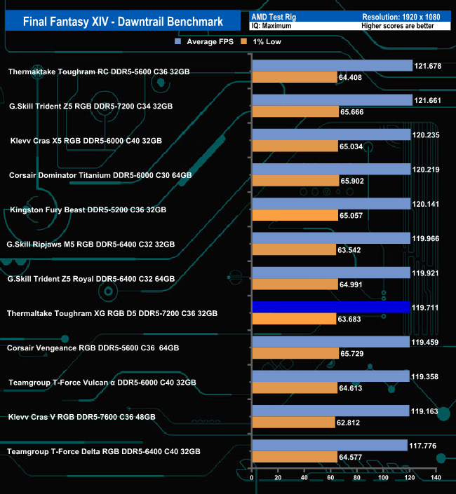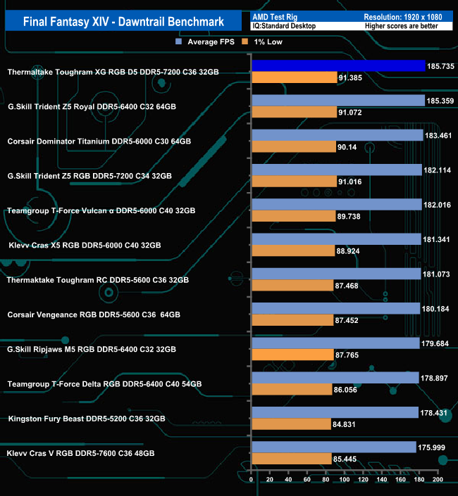 Although the ToughRAM XG RGB D5 sits in the lower half of the table using the Maximum quality settings in the Final Fantasy XIV-Dawntrail benchmark, when the settings are eased off to Standard desktop mode, the memory hits the top spot in the table. However, there's hardly anything between any of the modules in this gaming benchmark.