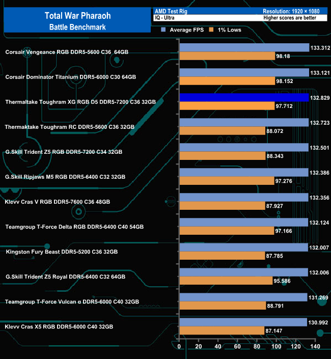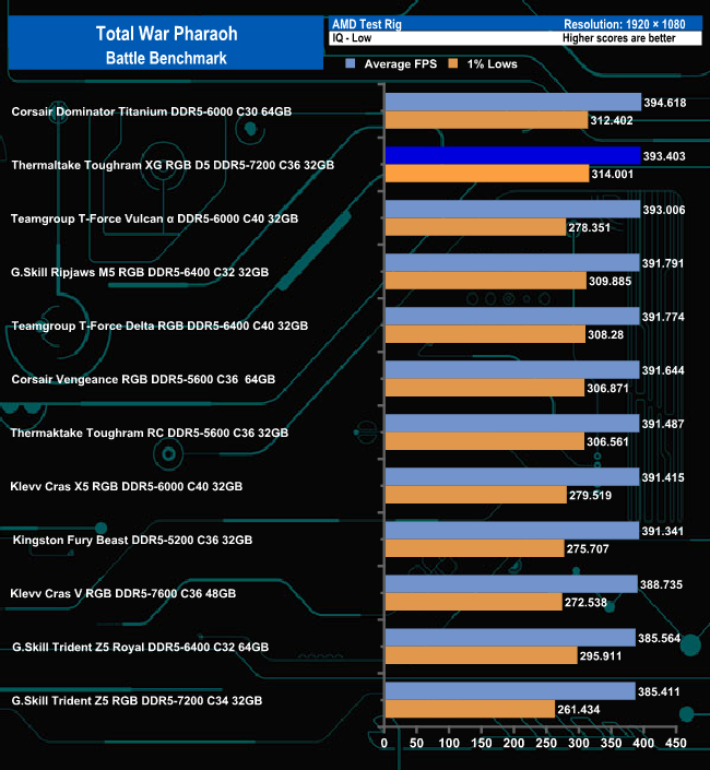 In the Battle benchmark of Total War Pharaoh's group of tests, there's nothing much to separate any of the modules at either quality setting. The ToughRAM XG RGB D5 sits in third place using the Ultra setting moving up a place when the quality settings are dropped to Low.