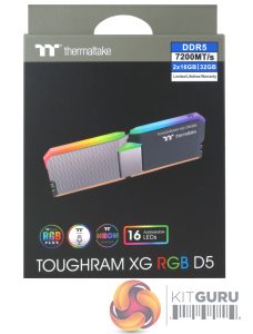 The front of the box has a clear image of what the memory modules look, like including how the RGB works. At the top right of the box is a sticker displaying the memory speed and the kit capacity (in this case 7200MT/s and 32GB 2 x 16GB). Under the main image is a line of icons representing Thermaltake's RGB Plus, Neon Maker, TT AI voice control support and having sixteen addressable LEDs.