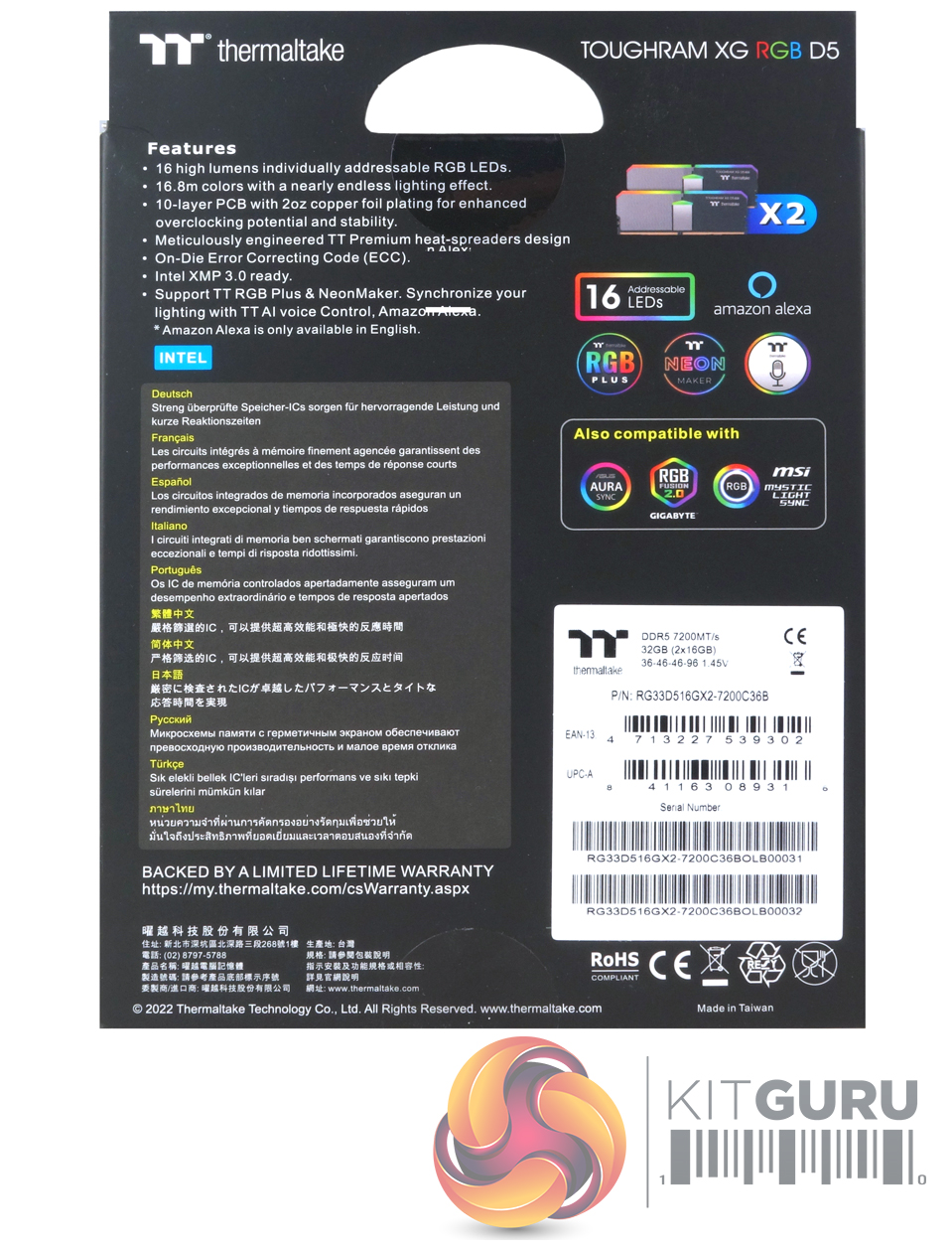 At the top left of the rear of the box is a bullet point feature list under which is a blue box showing that the kit supports Intel XMP. Under this are multi-lingual notes about the rigorously tested ICs. On the right-hand side, at the top is a very small image of the modules in the box under which are a group of icons for the sixteen addressable LEDs, Thermaltake's RGB Plus, Neon Maker TT AI voice control and Amazon Alexa support. Under this group is another with icons for 3rd party RGB compatibility; Asus Aura Sync, Gigabyte RGB Fusion 2.0, MSI Mystic Light Sync, and ASRock Polychrome RGB.