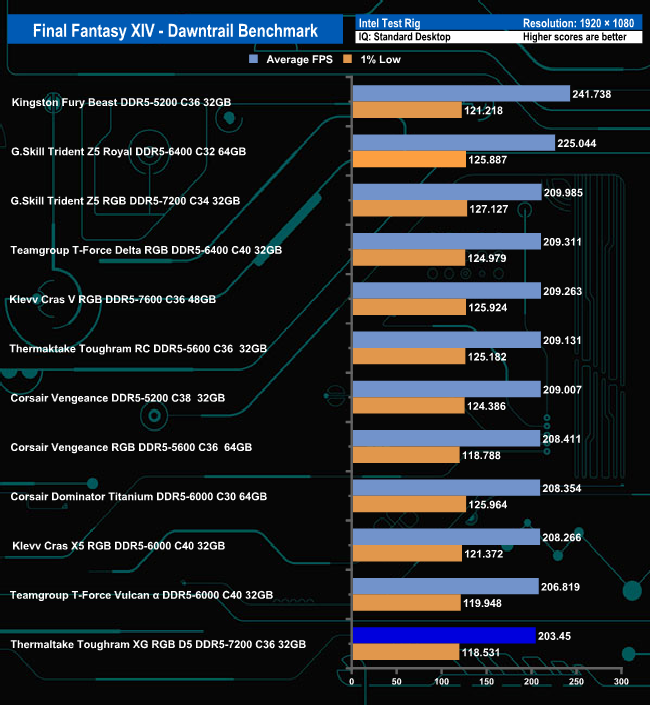 In the Battle benchmark of Total War Pharaoh, the ToughRAM XG RGB D5 memory sits in fifth place with the Ultra settings enabled and third from last with the Low settings on. But truth be told, for both tests there not much separating any of the modules.