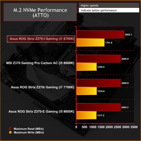 We tested our Samsung drive with the bare M.2 slot on the rear of the board and with the Asus Double Decker heatsink and saw no difference in performance, too, so there’s no sign of throttling – a sign that the temperatures are kept at reasonable levels.