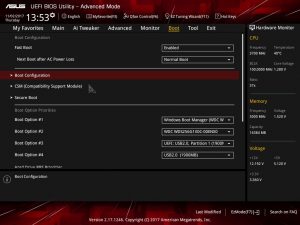 The Monitor menu has more voltages, temperatures and fan speeds than any other area of this UEFI, and the Boot menu has configurable options, fast boot tools, options to change the boot order and the usual override settings.