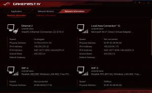 The GameFirst IV tool monitors the network usage of running applications – key for improving network responsiveness during intense gaming sessions. Other screens also serve up a Wi-Fi analyser and detailed networking information.