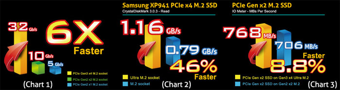 By contrast, the Ultra M.2 slot relies on PCI Express 3.0 x4 interconnection and thus boasts up to whopping ~4GB/s, two times higher compared to PCIe x4 and four times higher compared to PCIe x2 connection. The Ultra M.2 uses the same connector as the typical slot and thus is compatible with the same solid-state drives. Thanks to increased bandwidth the new Ultra M.2 slot provides, it can realize full potential of modern SSDs, such as Samsung XP941 (which is used by MacBook Pro laptops), unlike the default M.2. According to Asrock, its Ultra M.2 is up to 46 per cent faster than the typical M.2 socket.