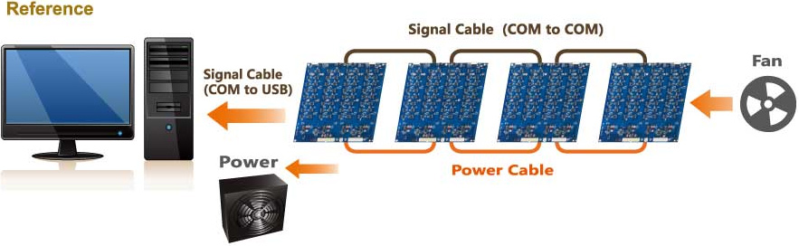 Biostar BTC-24GH mainboards feature 64 ASIC developed specially for mining Bitcoins, which have aggregate performance of 24 gigahashes per second (24GH/s). Every one of such mainboards consumes 130W, but is faster than 30 AMD Radeon HD 7970/Radeon R9 280X graphics cards, according to the maker. The mainboards can be daisy-chained using COM and power cables to build extremely powerful mining systems with multiple boards. The latter should be connected to PCs using a USB connection.