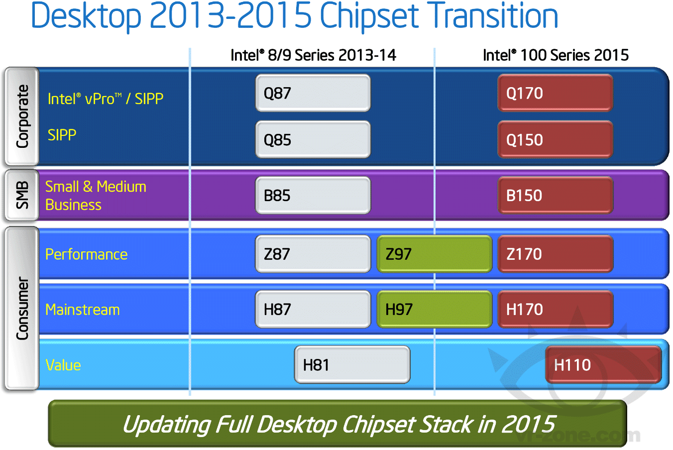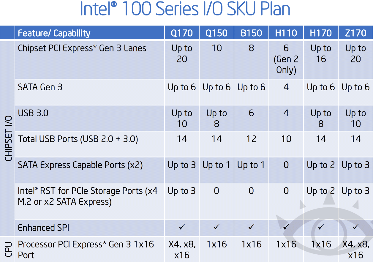 Intel’s 100-series family of chipsets for Skylake microprocessors will contain six members: Q170, Q150, B150, H110, H170 and Z170, according to a publication by Chinese VR-Zone web-site. The new core-logic sets will support from eight to 20 PCI Express 3.0 lanes, up to three SATA Express x2 ports, USB 3.0 SSIC specification (up to 10 ports) and so on.