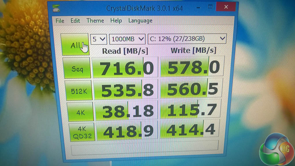 Well the PCI Express card version of the M6 was seen touching 770MB/sec in some CrystalDiskMark tests and the new interface version (which simply pushes flat onto the mainboard) scored around 715MB/sec.