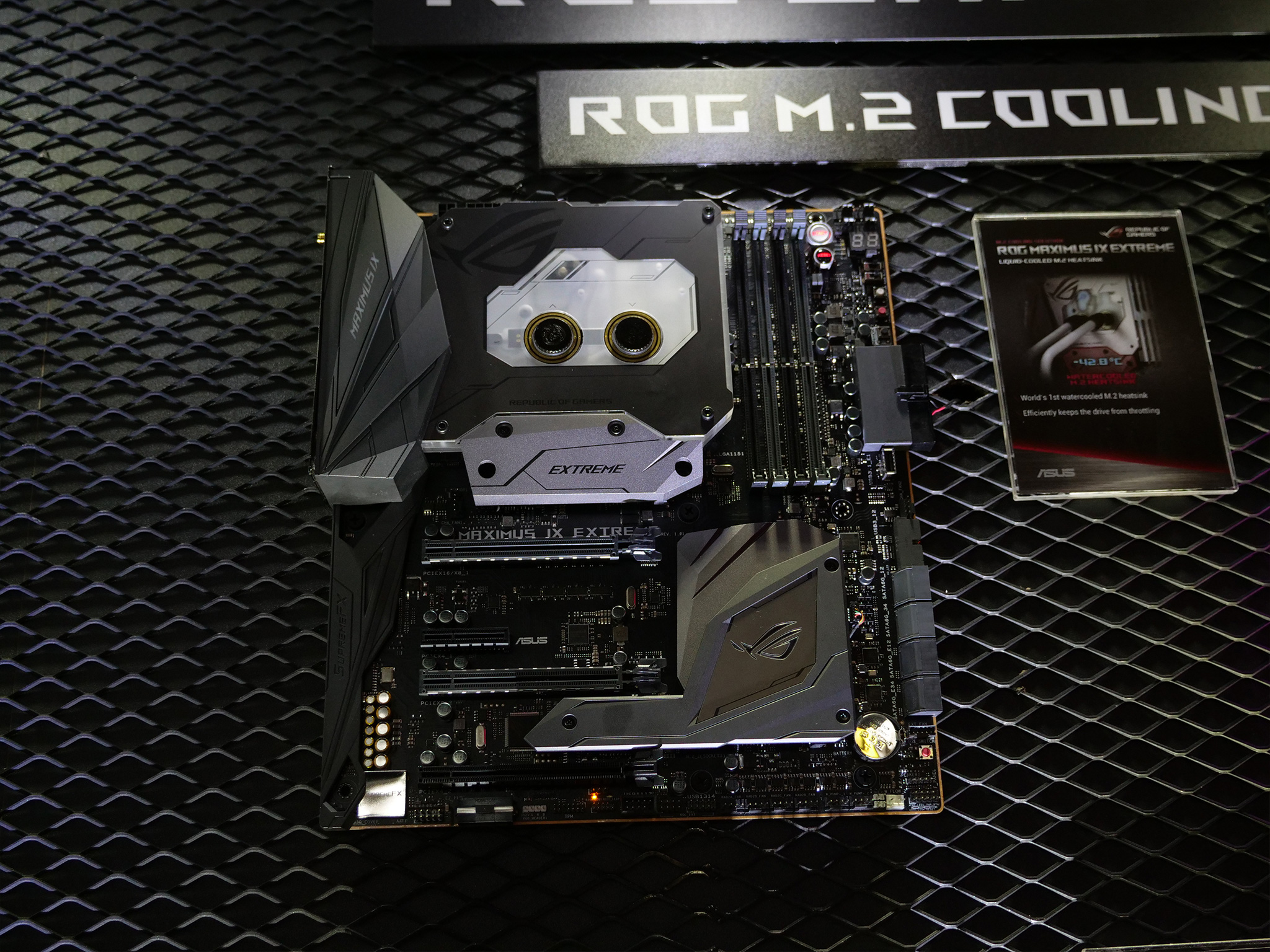 First of all, motherboards. The first thing we saw was the new Maximus IX Extreme Z270 board. This was first announced a couple of months ago, but it was good to get a look at ROG's flagship Z270 board. Most notably, it features a pre-installed monoblock to provide liquid cooling to your CPU, VRM module and even a M.2 drive.