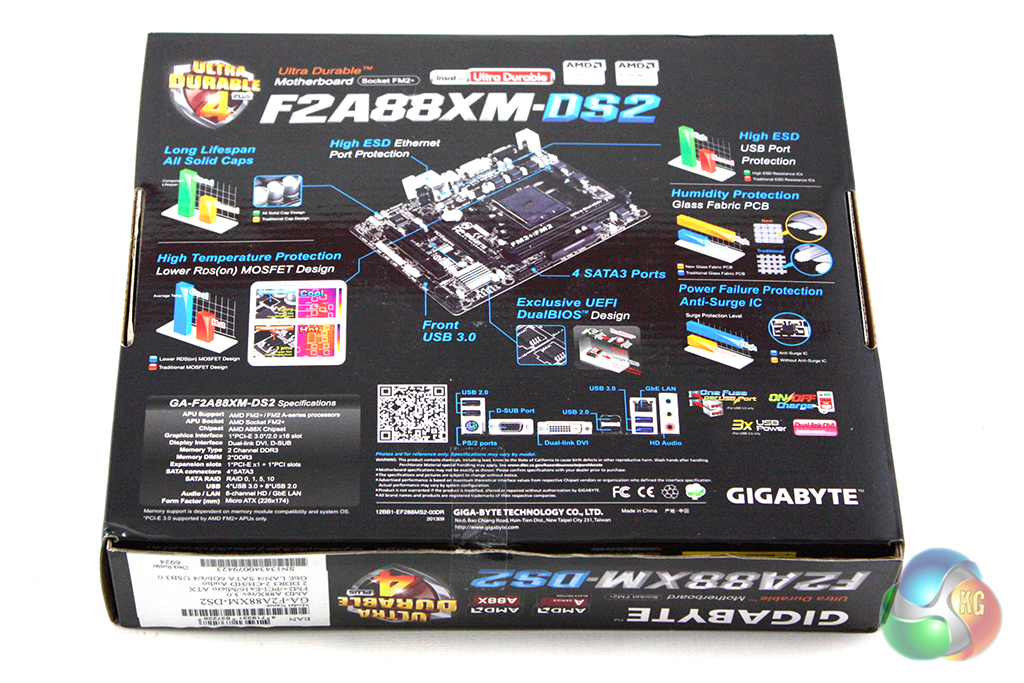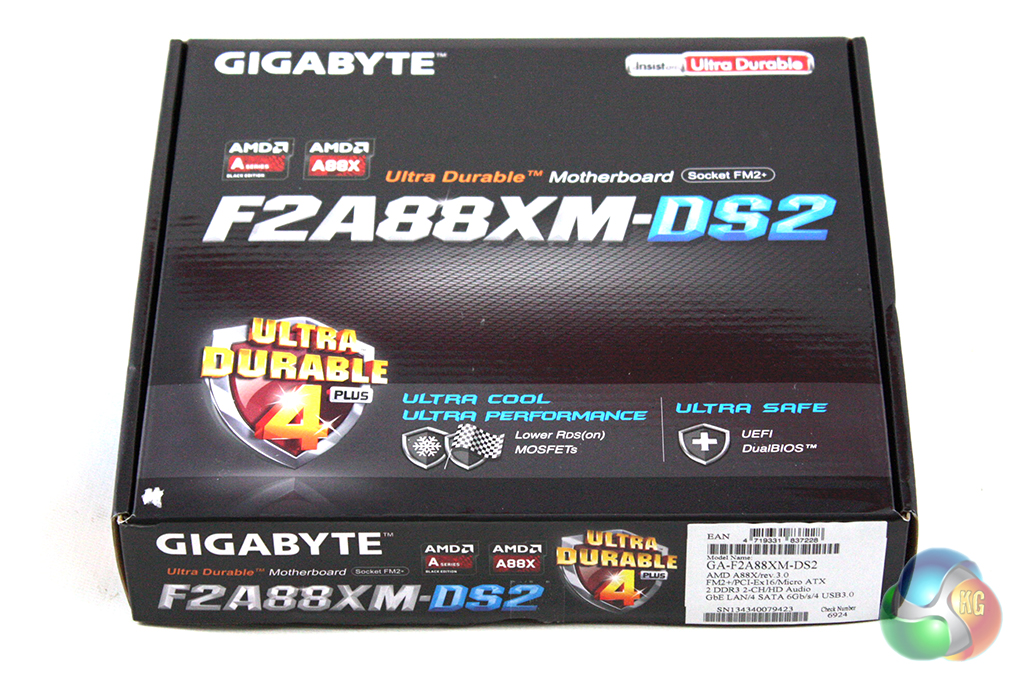 The F2A88XM-DS2 is supplied in a conventional motherboard box, which reflects the compact size of the motherboard within. Gigabyte have chosen to decorate it in a black livery, which features various badges on the front which describe some of the key features.